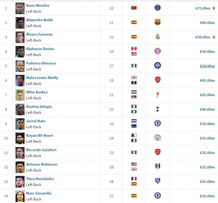 10月10日讯 德转今日更新法甲身价,巴黎左后卫努诺-门德斯身价上涨500万欧,来到7500万欧,牢牢占据世界左后卫身价榜第一位。
