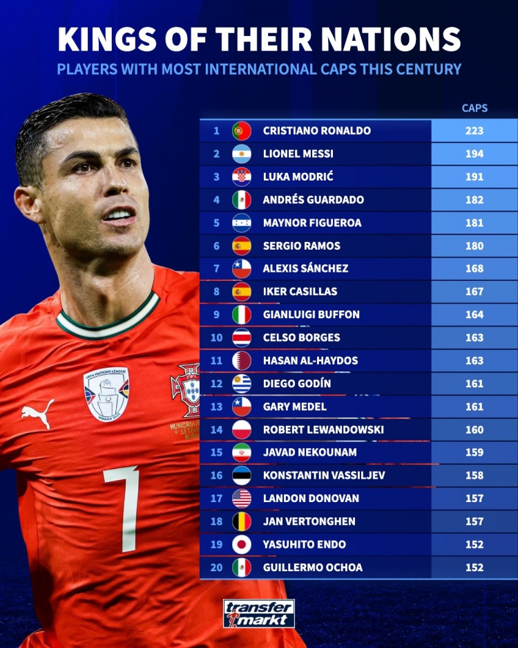 2025-10-13 09:30:02223场!C罗名列本世纪国际比赛出场次数最多的球员榜首