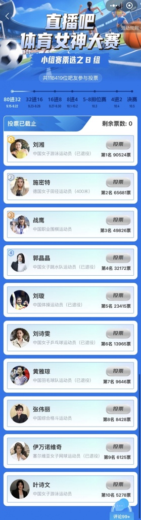 为你支持的她投票,每组前四将晋级淘汰赛!