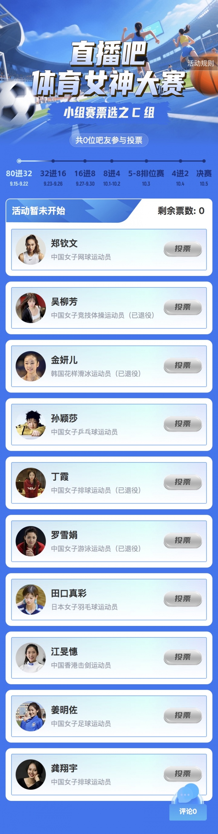 本次小组赛共分为8个小组,每组10名候选者,共80位体育女神参与角逐。